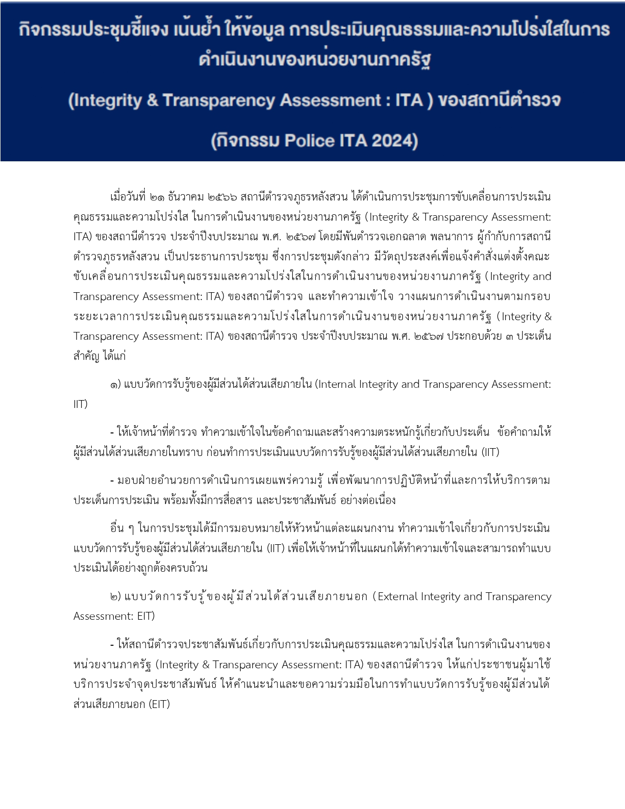 ประชุมชี้แจงกิจกรรม Police ITA 2024 21 ธันวาคม 2566 โดย admin langsuan / ข่าวประชาสัมพันธ์,ไม่มีหมวดหมู่ สถานีตำรวจภูธรหลังสวนขับเคลื่อนการประเมินคุณธรรมและความโปร่งใสในการดำเนินงานของหน่วยงานภาครัฐ (Integrity and Transparency Assessment: ITA) ของสถานีตำรวจประจำปีงบประมาณ พ.ศ. 2567 Facebook iconFacebookTwitter iconTwitterLINE iconLine