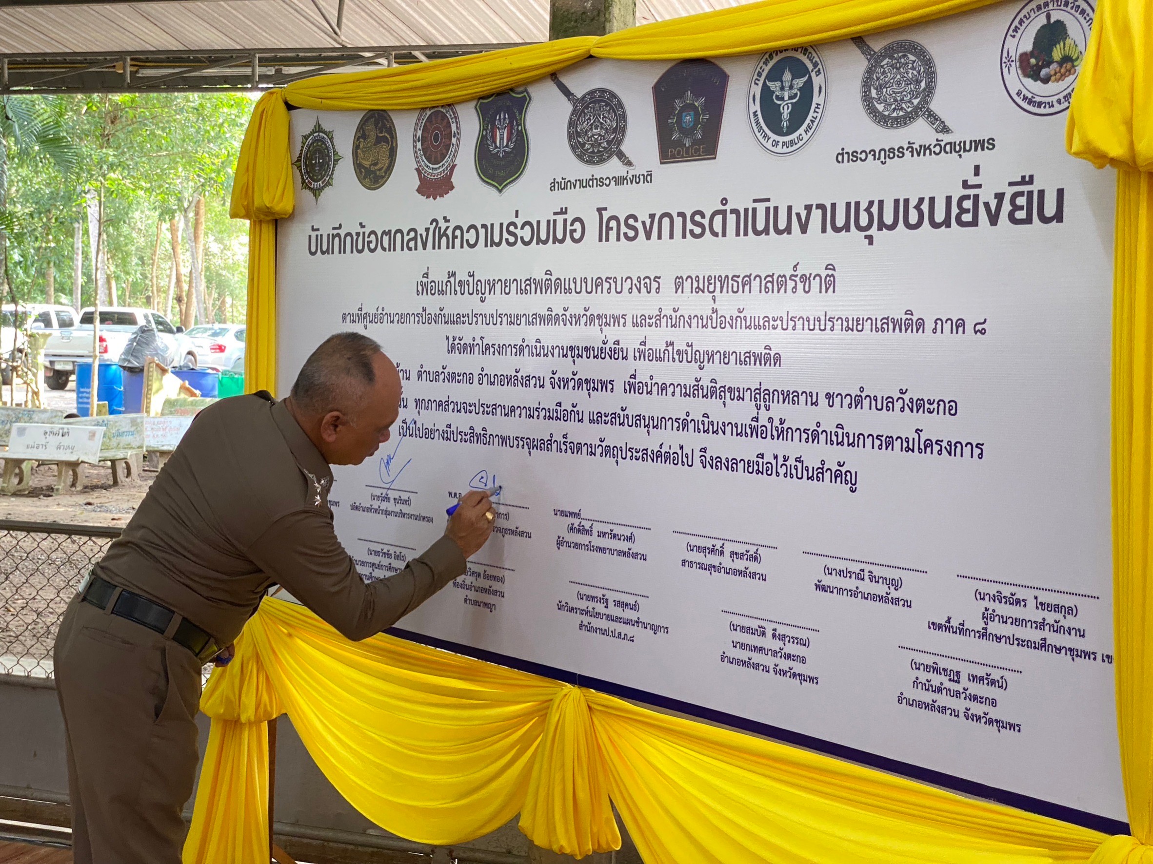 พล.ต.ต.ภาณุเดช ณ พัทลุง ผบก.ภ.จว.ชุมพร ตรวจเยี่ยมโครงการชุมชนบำบัดอย่างยั่งยืนในตำบลแพร่ระบาดยาเสพติดสูงสุด 100 ตำบล ตามนโยบายเร่งด่วนของรัฐบาล